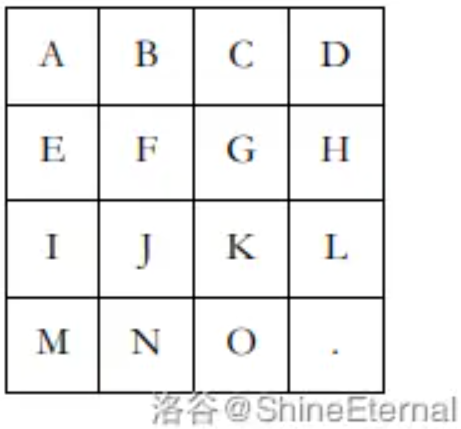 给定一个 $4\times 4$ 的方格棋盘,里面有 $A\sim O$ 这 $15$ 个字母,还有一个 `.` (表示空位),字母的标准位置如图所示。