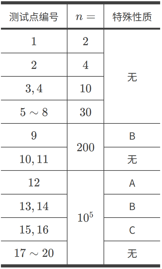 - $2 \leq n \leq 10^5$,且 $n$ 为偶数;